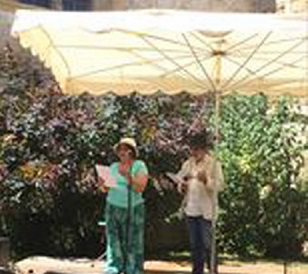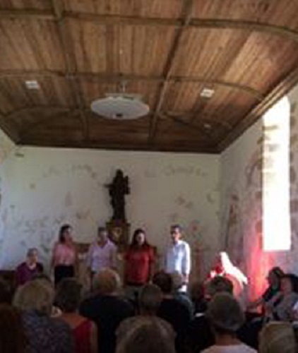 Le dimanche matin, à la Chapelle des Chauveix, un public nombreux a suivi la prestation de Muriel MINGAU (voir photo 13), poète et dramaturge, qui avait composé spécialement pour l'occasion un texte original sur cette chapelle et sa fresque murale, oeuvre de Roch POPELIER. Christine DE VILLENEUVE, maire de Vicq-sur-Breuilh, a aussi présenté l'historique de la chapelle et de son décor (voir photo 14).