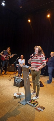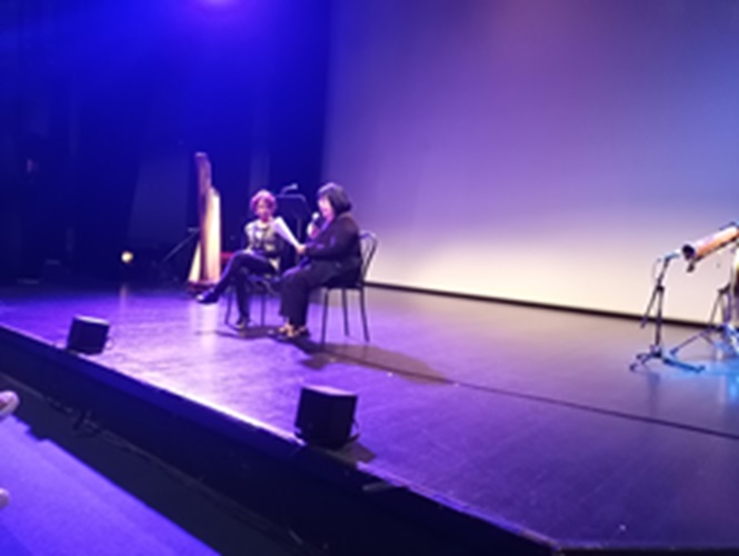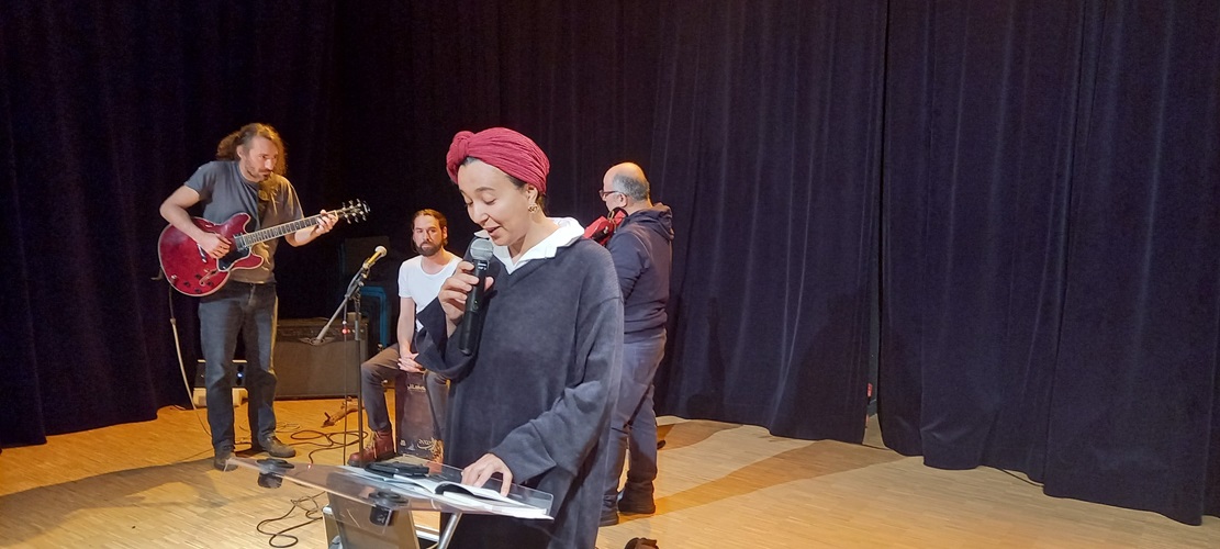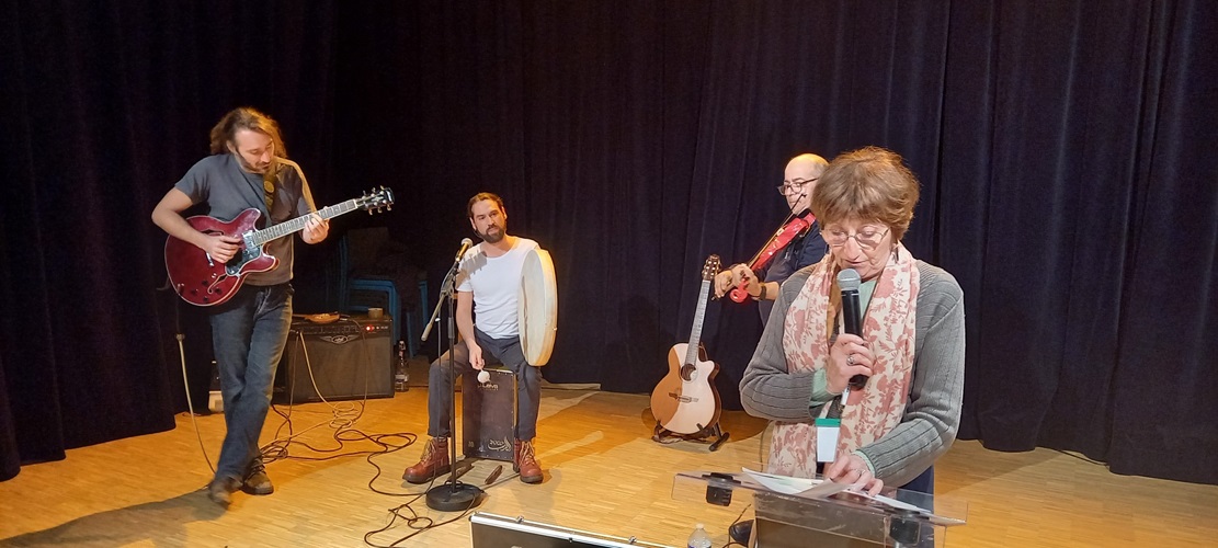 Voici un commentaire de Eve GUILLOU, une autrice présente, sur la soirée "Poésie et musique" du samedi soir à l'auditorium de la Médiathèque : "Ce furent 2 jours et demi de purs moments de littérature, poésie, et de rencontres. Le samedi soir, chacun posait ses mots : extraits de textes, poésies habitées, accompagnées aux sons des musiciens venus d’ailleurs, musique envoûtante, improvisée. Parfois les mots s’accordaient entre les lignes des cordes, sur le rebond d’un tambour; ils entraient dans la musique pour faire conversation. D’autres fois, c’était au tour des notes de souffler la mélodie en harmonie avec les lettres. Ce fut doux et joyeux, derviches et tourneur enveloppant la nuit d’une envoûtante amitié commune.