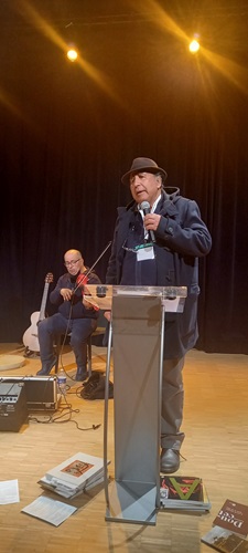 La table ronde "Poésie et résistance", animée magistralement par Laurent DOUCET, a permis de réfléchir ensemble sur le rôle de la poésie dans les moments de violence historique ou politique et de répression, avec des exemples concrets. Les deux invités d'honneur de cette table ronde étaient : Aytekin KARAÇOBAN, poète et traducteur franco-turc (auteur chez Mars-A d'une "Anthologie de la poésie turque de 1950 à nos jours" et du recueil "Le silence sous la langue" Prix Rimbaud 2023), et Francis Combes, poète et éditeur (Le temps des Cerises). Marie VIROLLE a lu le poème de Mahmoud Darwich "Carte d'identité" et présenté le n°21 de la revue A où se trouve un important dossier "Paroles pour un peuple et une terre - Gaza Palestine (voir photo 11, de g. à dr. : Marie Virolle, Aytekin Karaçoban, Laurent Doucet, Francis Combes, Christian Viguié).