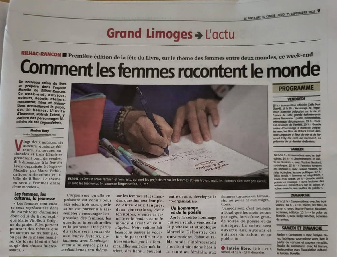 •Le Populaire du Centre présente dans son édition du 24 septembre 2025 la Fête du livre "Femmes entre deux mondes" de Rilhac-Rancon,